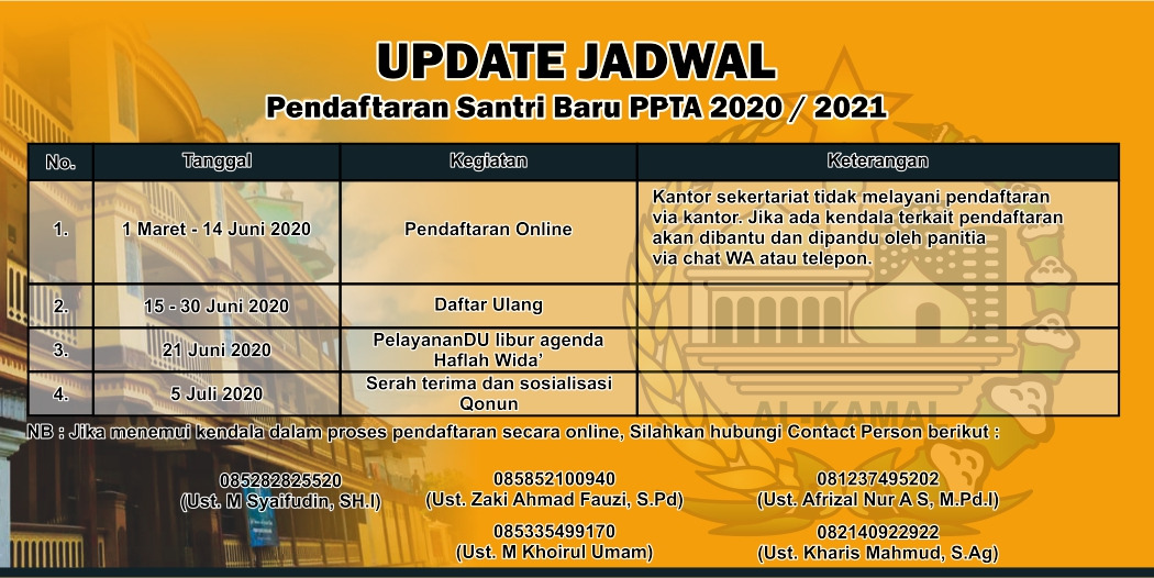 Diumumkan kepada seluruh calon santr baru Pondok Pesantren Terpadu Al Kamal, bahwa jadwal daftar ulang PSB 2020/2021 mengalami perubahan sebagai berikut: [table id=5 /] Catatan: