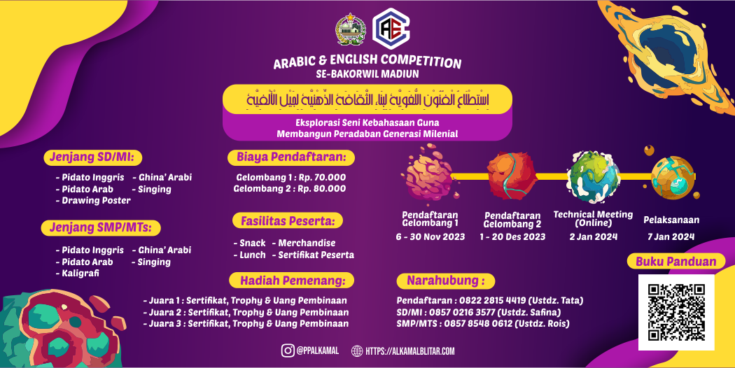 Kabar gembira untukadik-adik SD/MI-SMP/MTs. Yuk, asah kemampuan berbahasa Arab dan Inggris kalian pada Arabic and English Competition (AEC) 2022 di Pondok Pesantren Terpadu Al-Kamal. Perlombaan